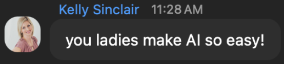 100% yes. Her AI Club is for women entrepreneurs in every industry who are using AI in their businesses and want to go deeper. You don't have to be building AI products or working in tech. You just have to be someone who's into what AI can do for YOUR business — whatever that is. 💜